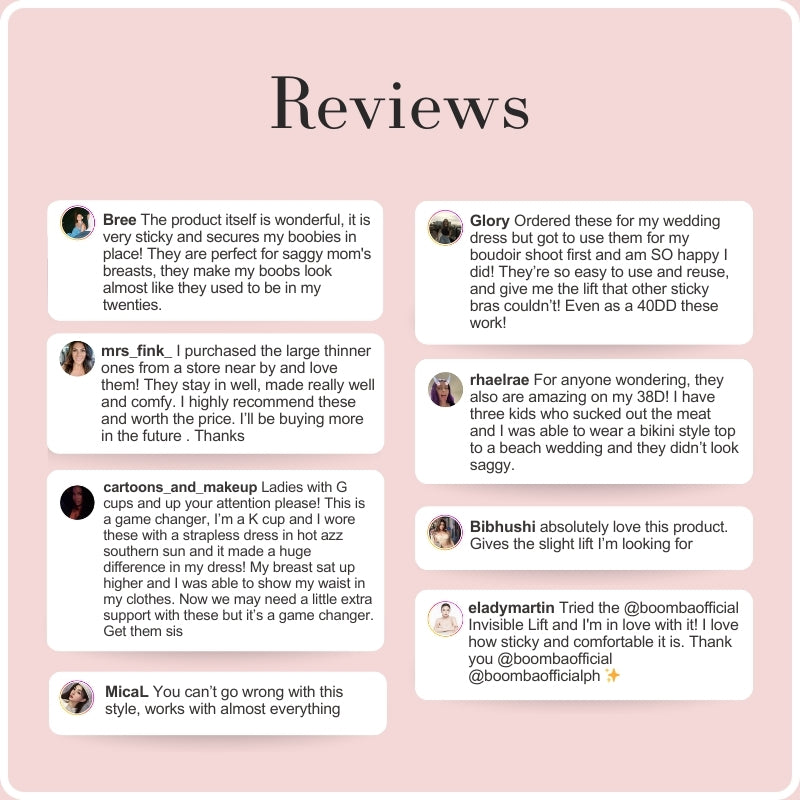 Unlike a sticky bra that is supported by the adhesive, BOOMBA inserts are supported by the clothing, they cannot stay up by themselves. It is crucial to wear them in tight, structured, and fitted tops.