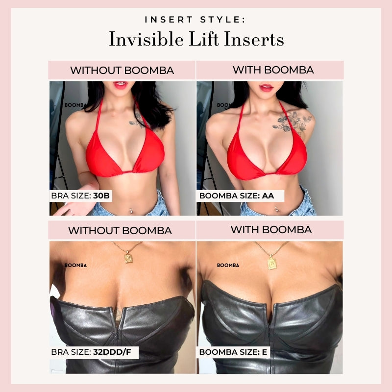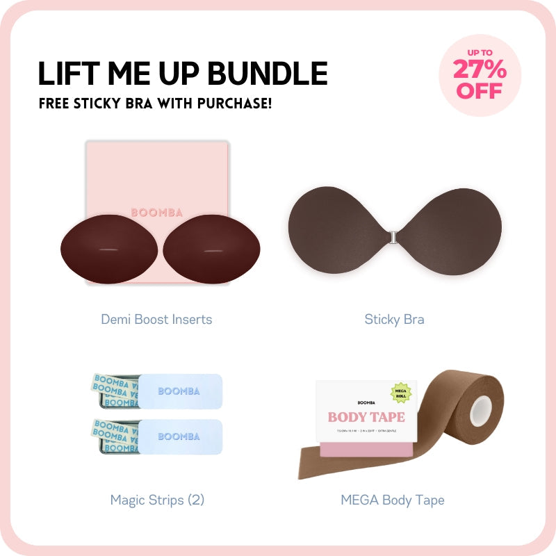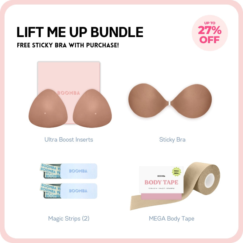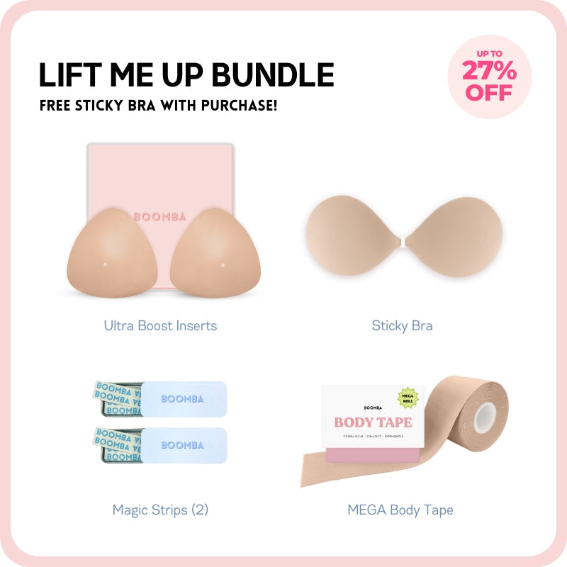 If you're looking for a little more cleavage or just want to add more security to your outfit, this bundle is perfect for you. This bundle includes 1 Pair of Inserts, 1 Sticky Bra, 2 Tins of BOOMBA Magic Strips, and 1 MEGA Body Tape. The bundle will help you have that natural lift and volume.